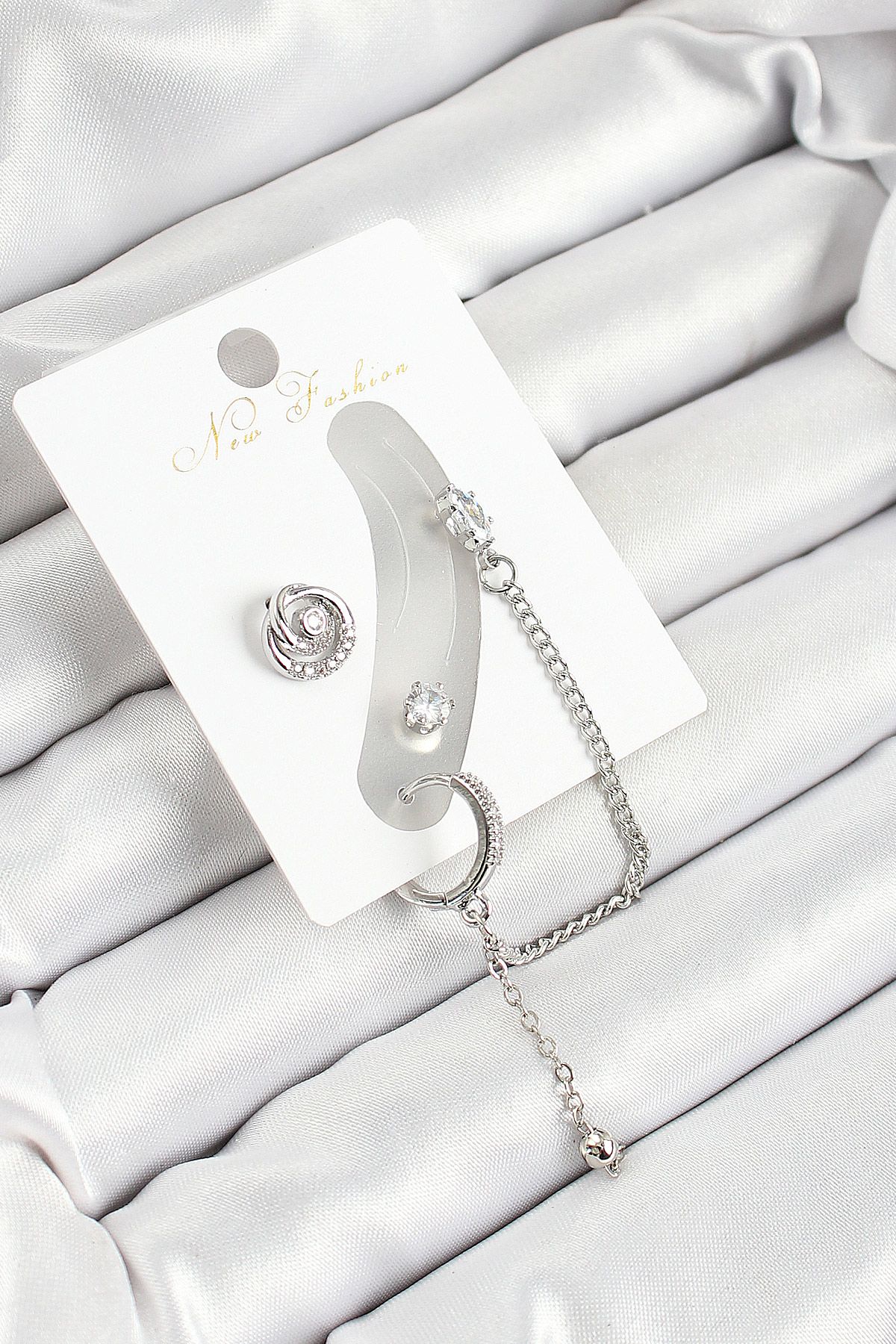 Pirinç Halka Figürlü Zirkon Taşlı Gümüş Renk 3'lü Kıkırdak Kadın Küpe Set