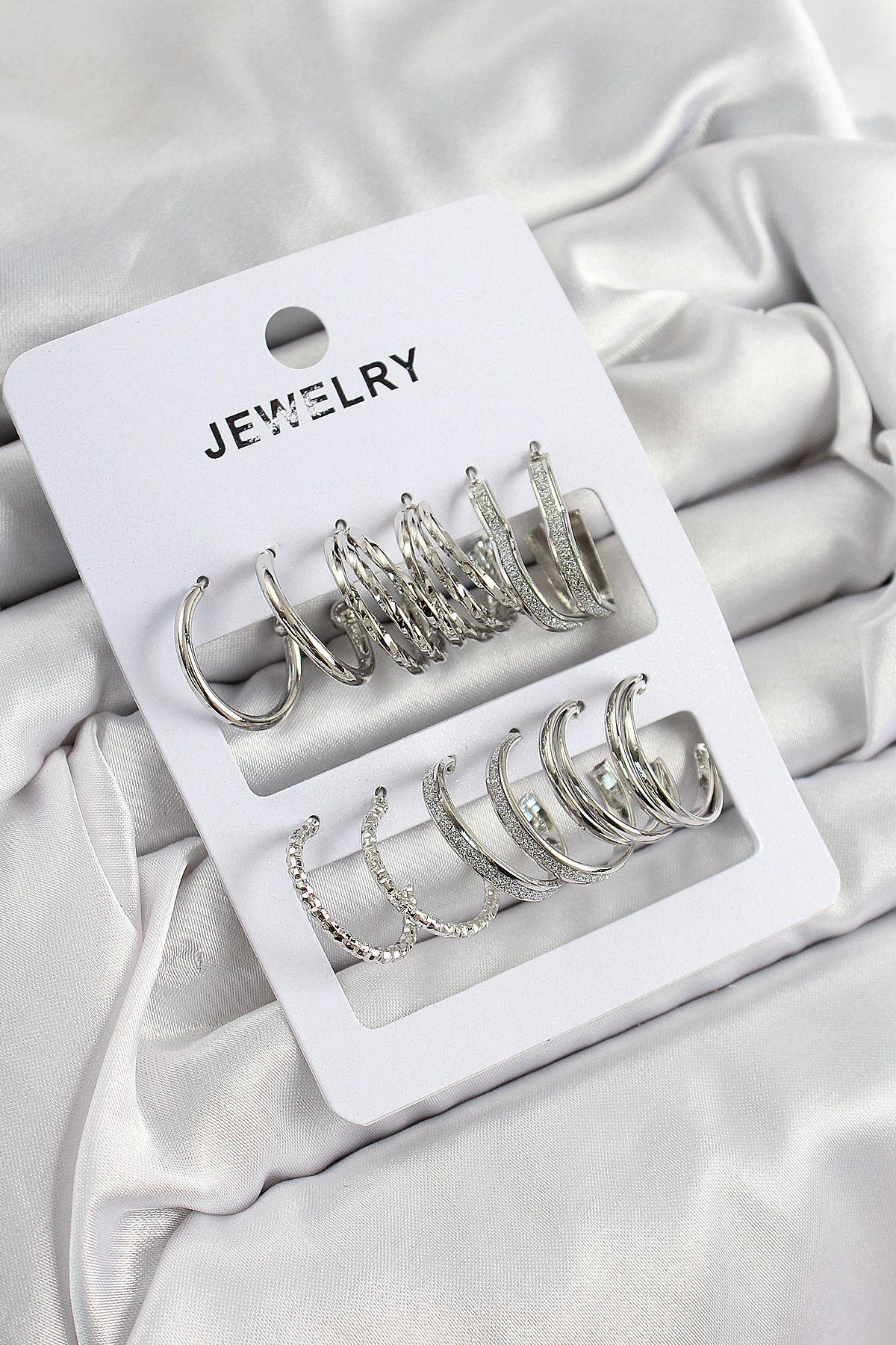 Pirinç Karışık Halka Model Gümüş Renk 6 Çift Kadın Küpe Set