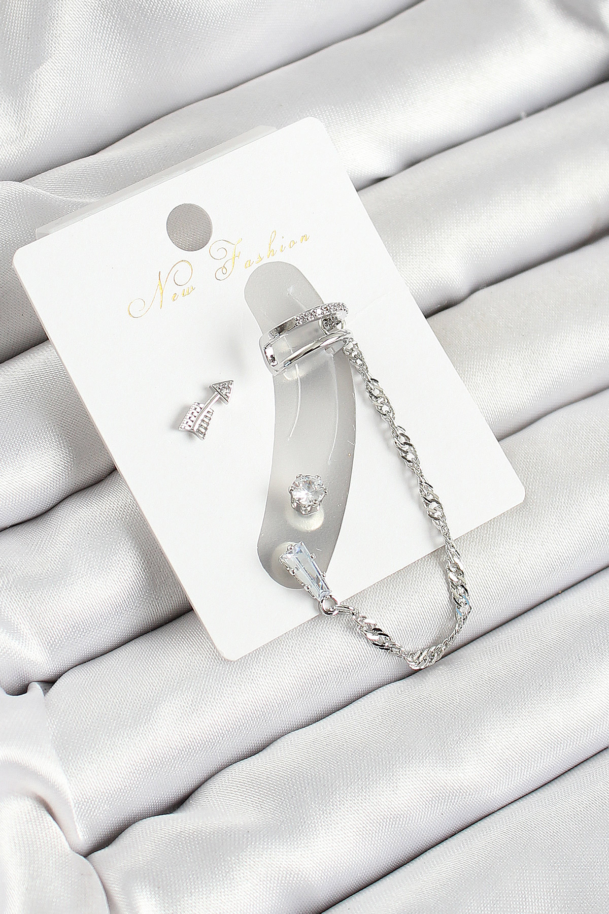 Pirinç Ok Figürlü Zirkon Taşlı Gümüş Renk 3'lü Kıkırdak Kadın Küpe Set