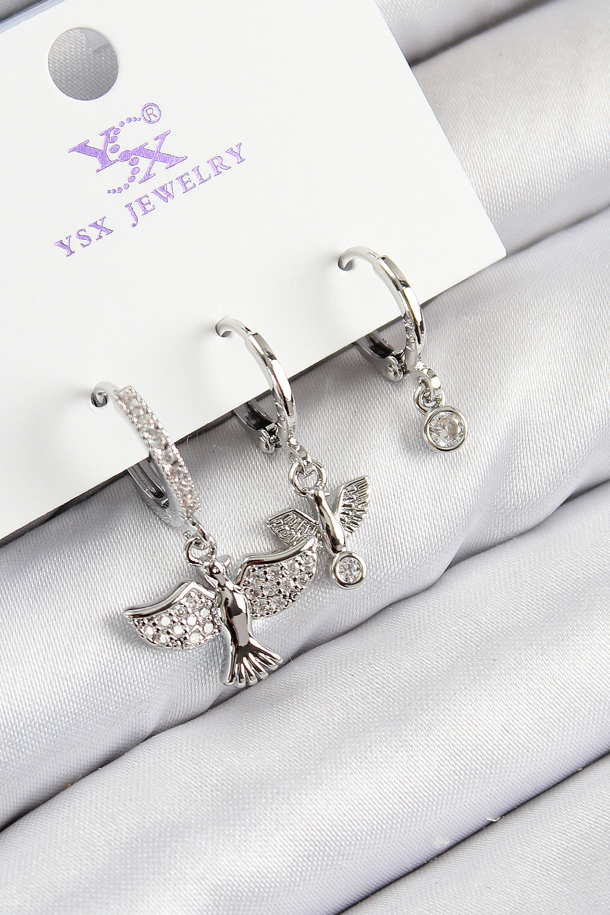 Pirinç Zirkon Taşlı 3'lü Kuş Model Gümüş Renk Kadın Küpe