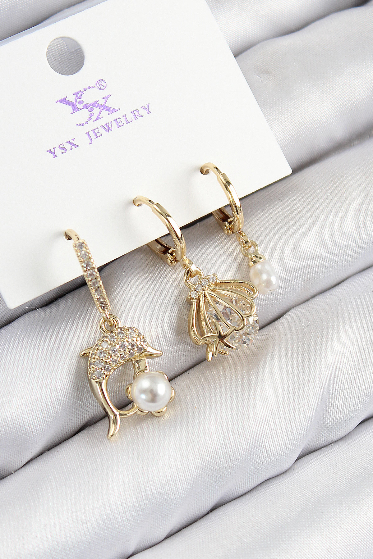 Pirinç Zirkon Taşlı 3'lü Yunus Balığı Ve İstiridye Model Gold Renk Kadın Küpe