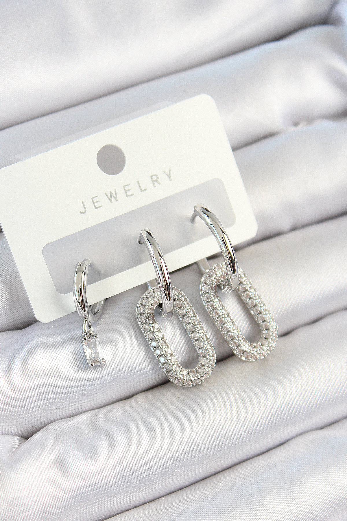 Pirinç Zirkon Taşlı Dikdörtgen Model Gümüş Renk 3'lü Çift Kadın Küpe Set