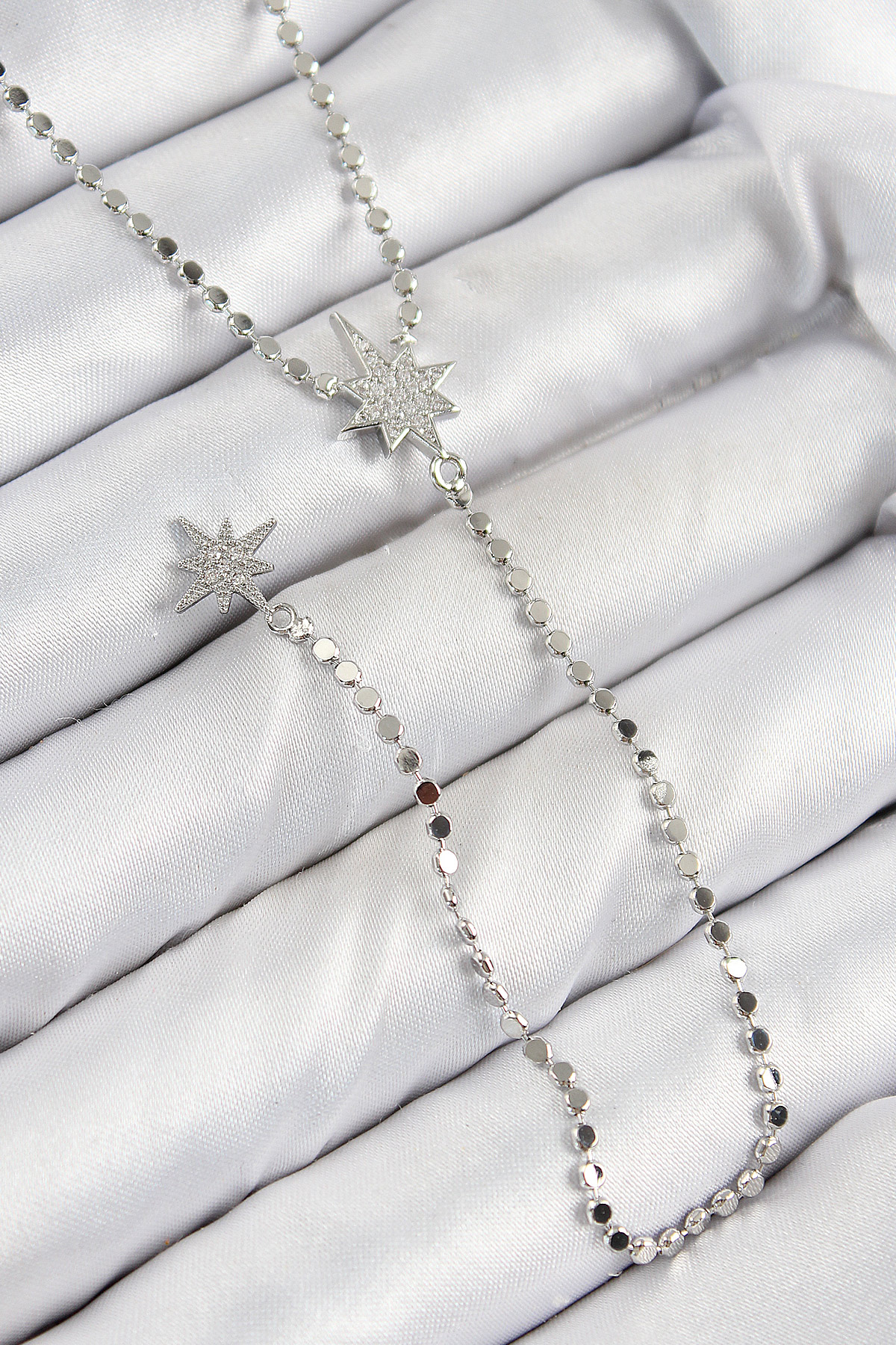 Pirinç Zirkon Taşlı Ezme Zincirli Kutup Yıldızı Model Gümüş Renk Y Kolye