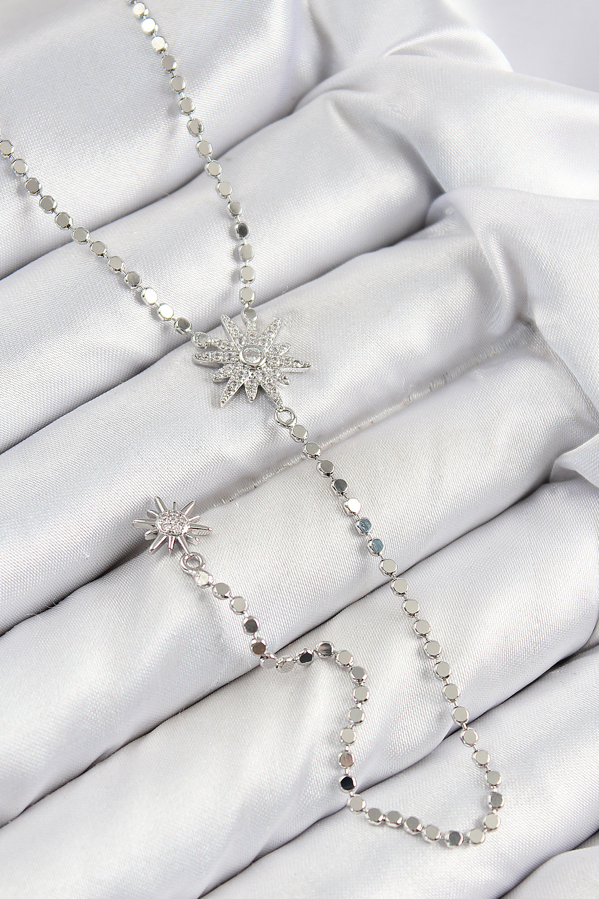 Pirinç Zirkon Taşlı Ezme Zincirli Kutup Yıldızı Model Gümüş Renk Y Kolye