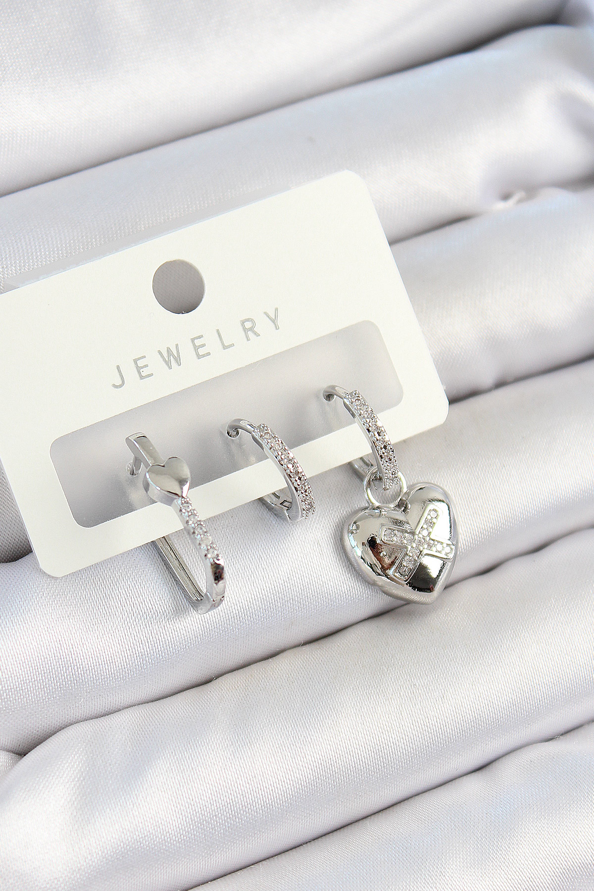 Pirinç Zirkon Taşlı Kalp Model Gümüş Renk 3'lü Çift Kadın Küpe Set
