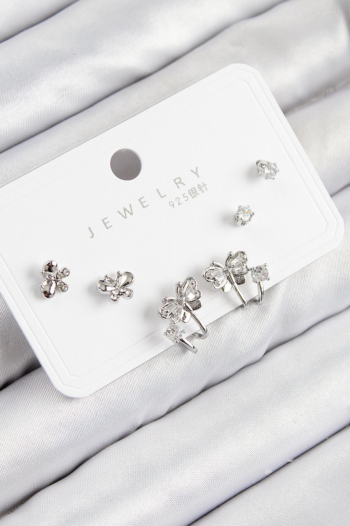 Pirinç Zirkon Taşlı Kelebek Model Gümüş Renk 925 Ayar Gümüş Çivi Kadın Küpe Set