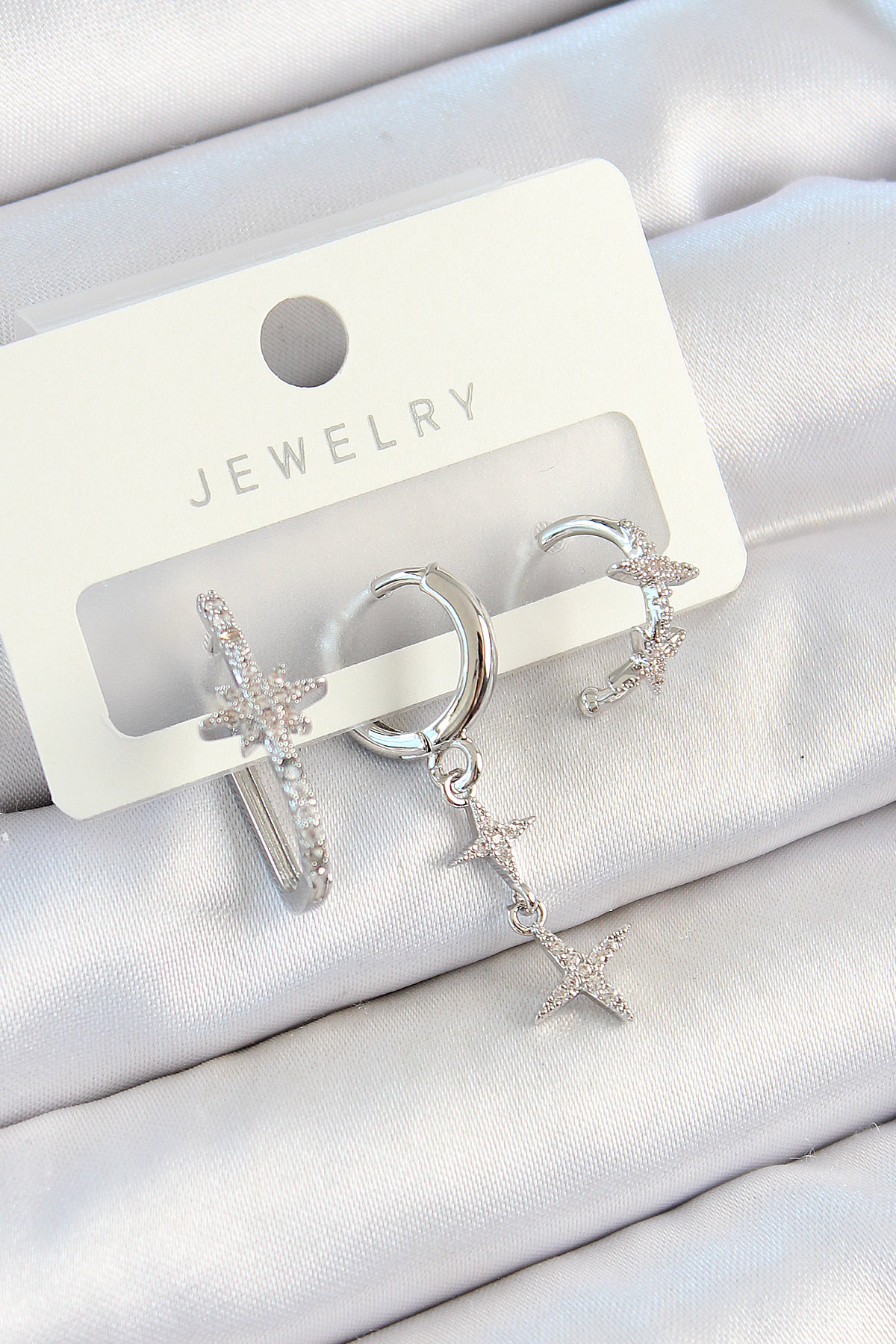 Pirinç Zirkon Taşlı Kelebek Ve Sallantılı Yıldız Model Gümüş Renk 3'lü Çift Kadın Küpe Set