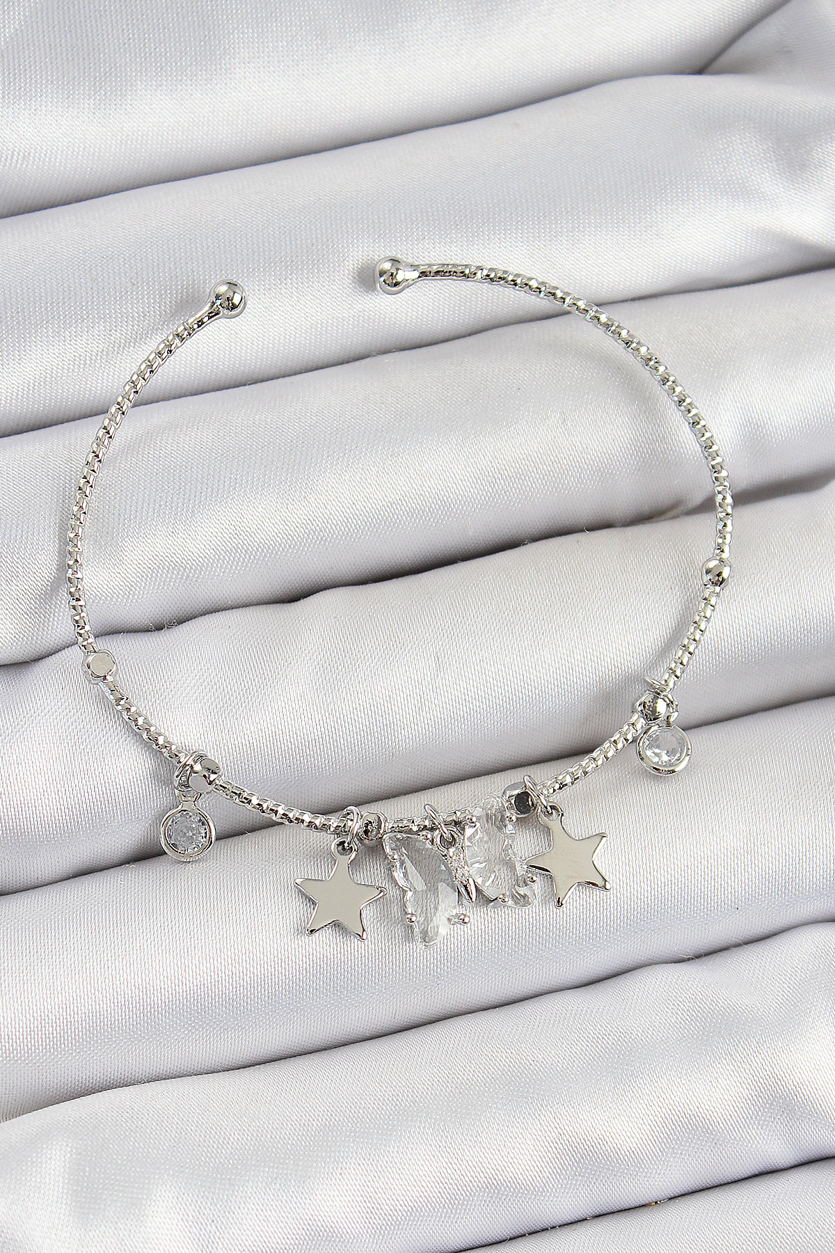 Pirinç Zirkon Taşlı Kelebek Ve Yıldız Model Gümüş Renk Charm Bileklik