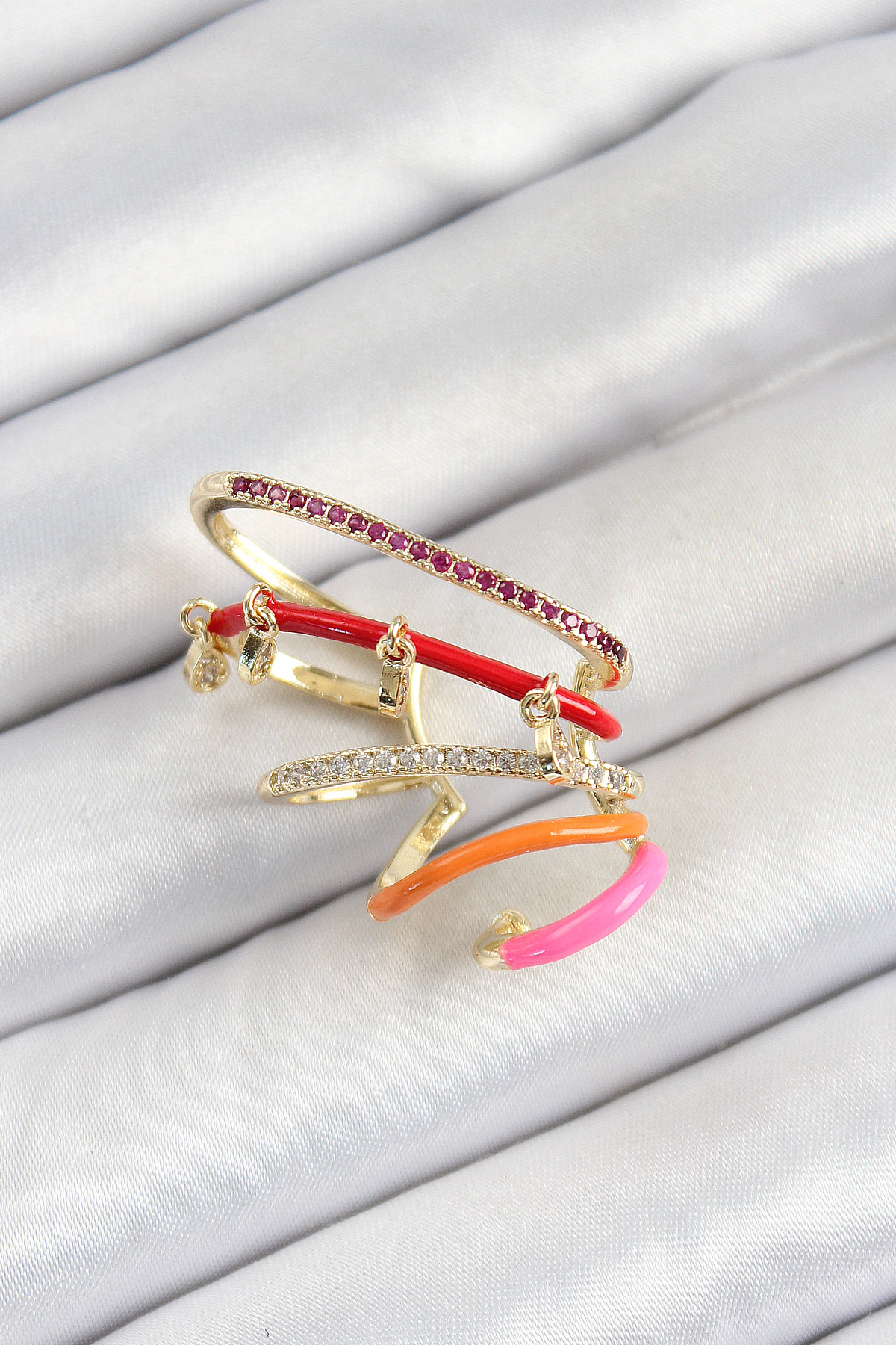 Pirinç Zirkon Taşlı Kırmızı Turuncu Pembe Sıkıştırma Sağ Kıkırdak Gold Renk Kadın Küpe