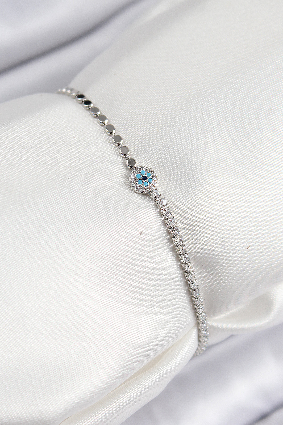 Pirinç Zirkon Taşlı Nazar Model Ezme Zincir Gümüş Renk Kadın Bileklik