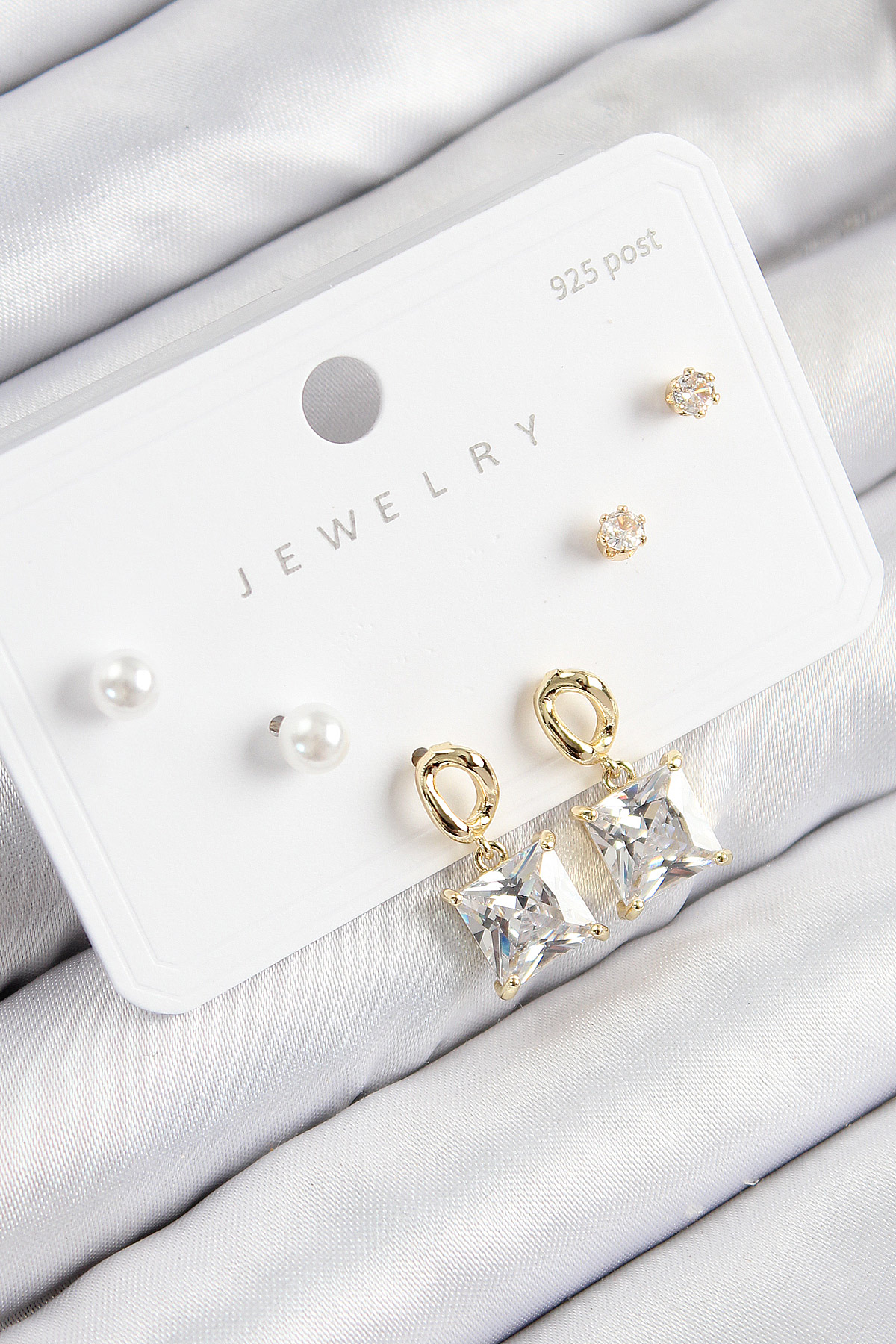Pirinç Zirkon Taşlı Sallantılı Kare Model Gold Renk 925 Ayar Gümüş Çivi Kadın Küpe Set