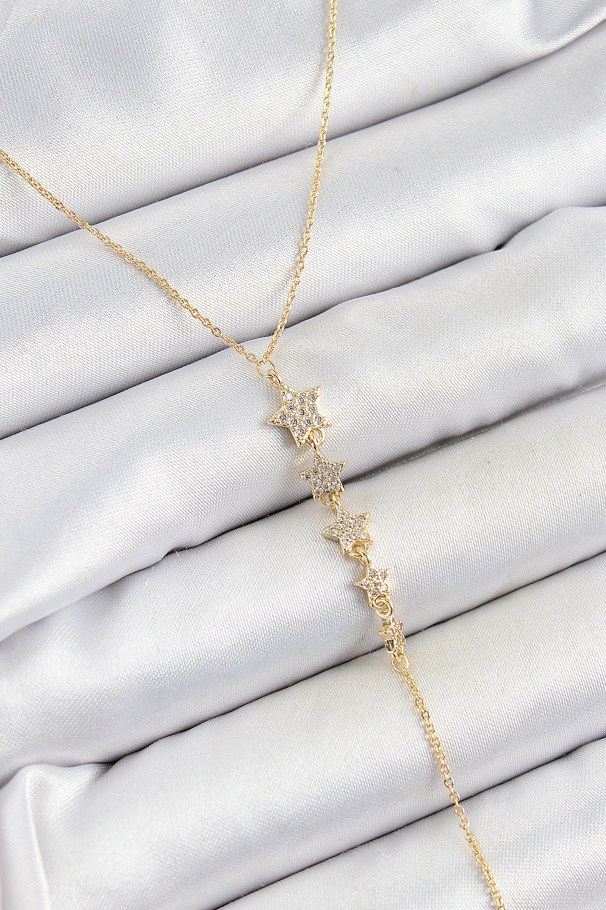 Pirinç Zirkon Taşlı Sıralı Yıldız Figürlü Y Model Gold Renk Kadın Kolye