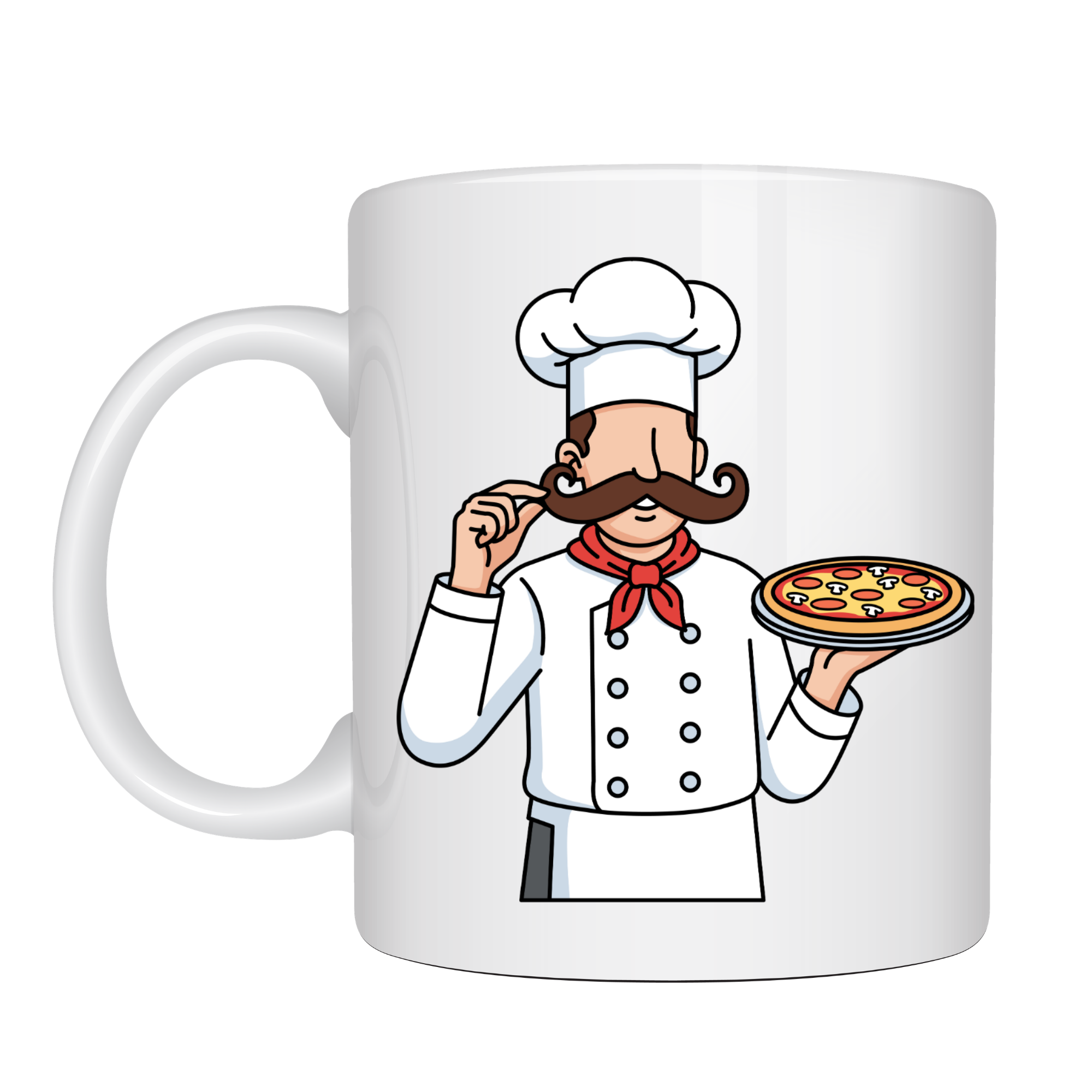 Bu porselen kupanın üzerinde, kıvrık bıyıklarıyla dikkat çeken karizmatik bir pizza ustası yer alıyor. Elinde tuttuğu pizza ve kendinden emin duruşu, mutfakta geçirilen keyifli anları ve lezzetli tariflerin arkasındaki emeği simgeliyor.