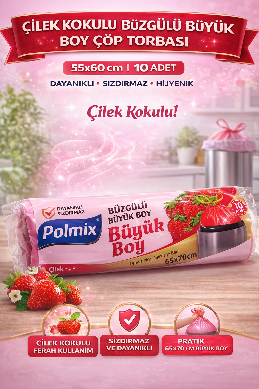 Polmix Çilek Kokulu Büzgülü Büyük Boy Çöp Torbası 65x70 cm 10'lu 1 Paket Dayanıklı Sızdırmaz Çöp Poşeti