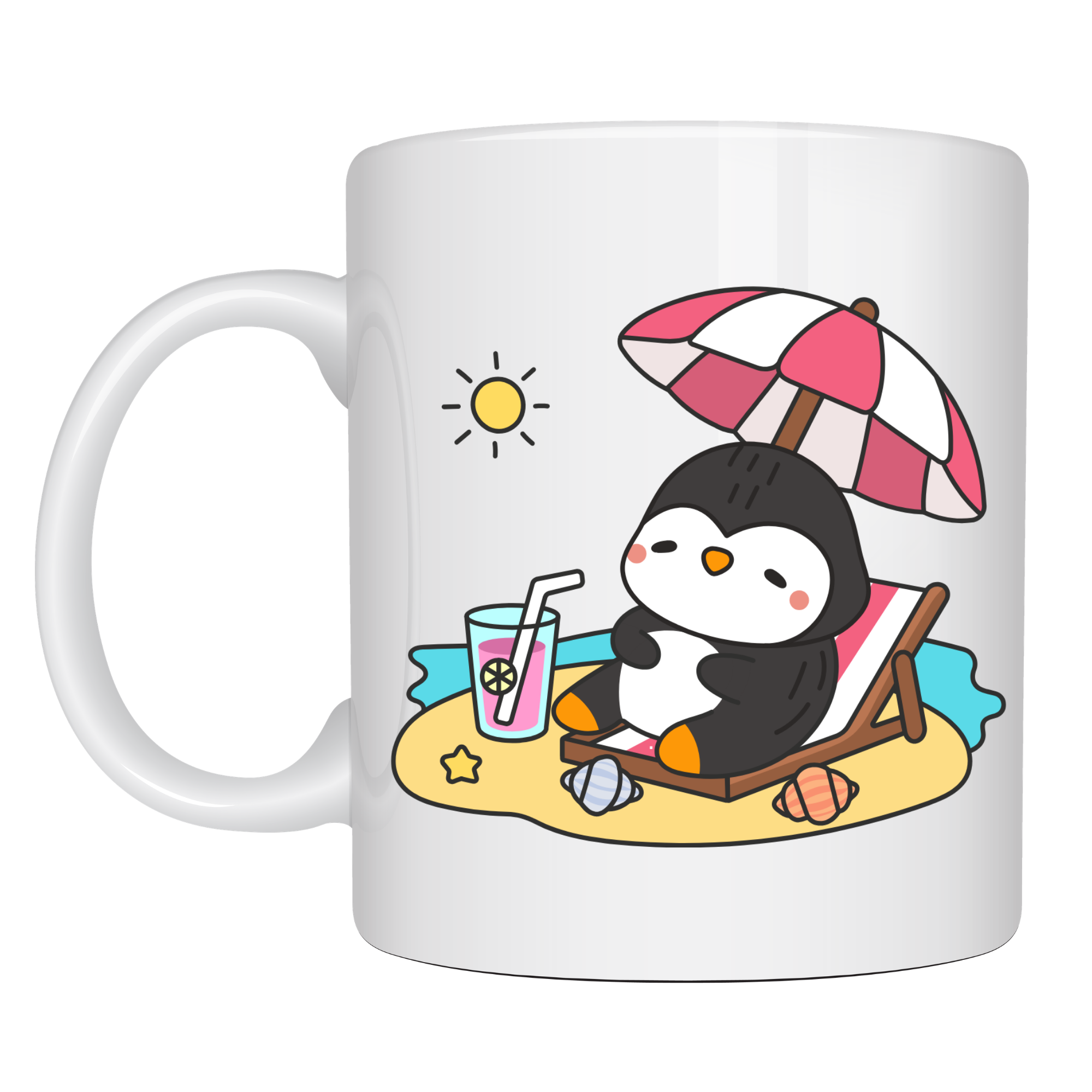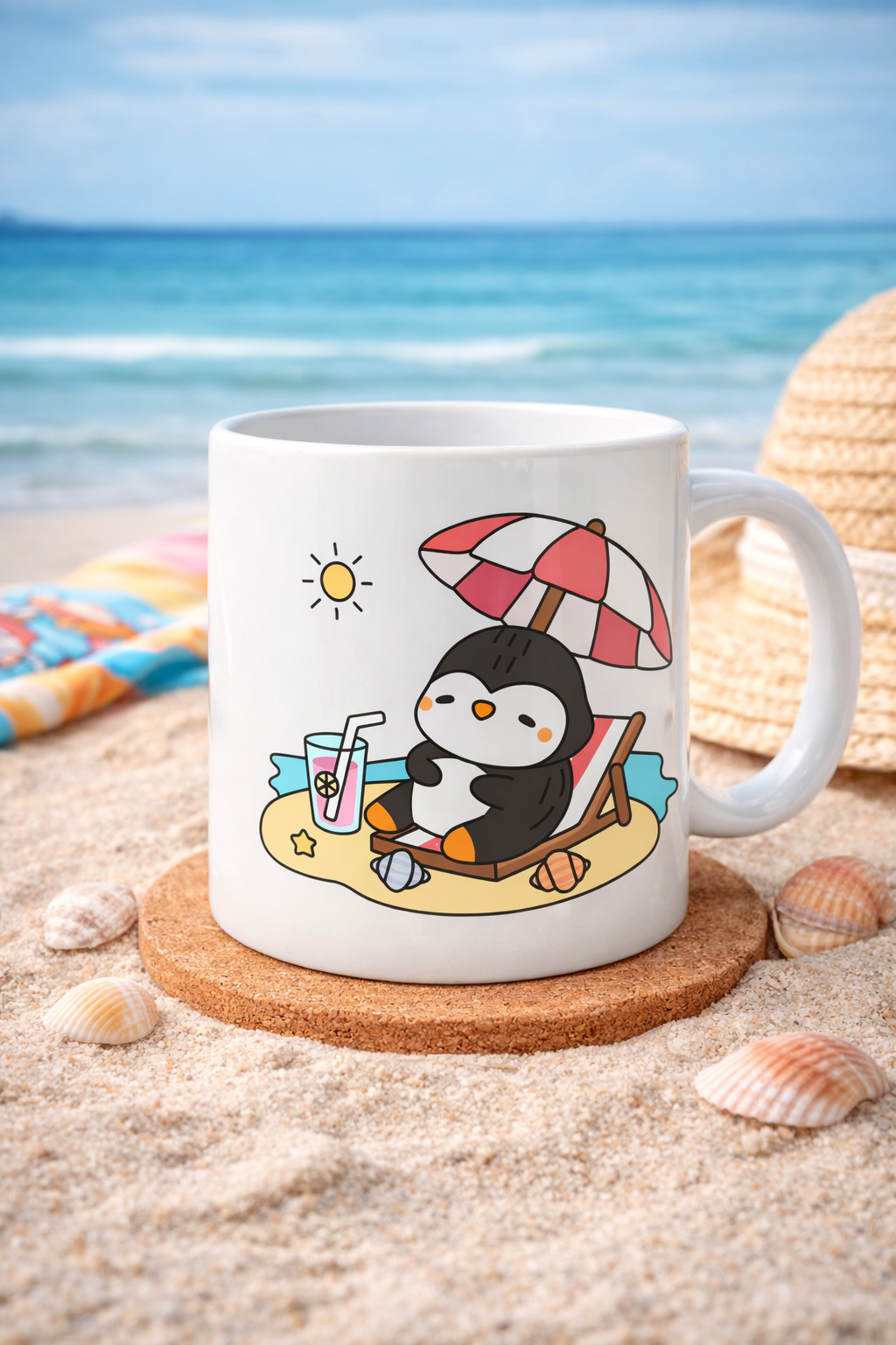 Bu özel tasarım porselen kupanın üzerinde, güneşli bir sahilde şezlongda dinlenen tatlı bir penguen yer alıyor. Şemsiyesinin altında keyifle uzanan penguen, yanında serin içeceğiyle tatilin huzurunu ve dinlenmenin keyfini yansıtıyor. Bu sevimli sahne, yoğun günlerin arasında küçük bir mola vermeyi ve hayatın keyifli anlarını hatırlatan eğlenceli bir hikâye anlatıyor.