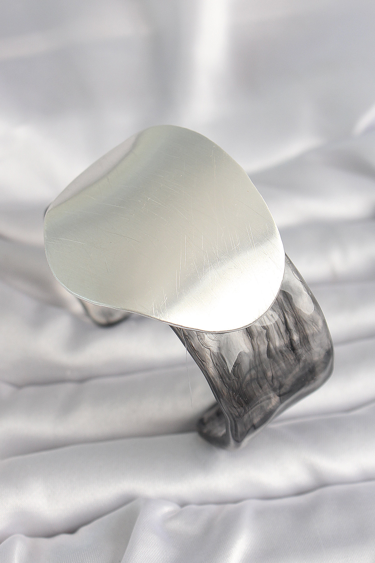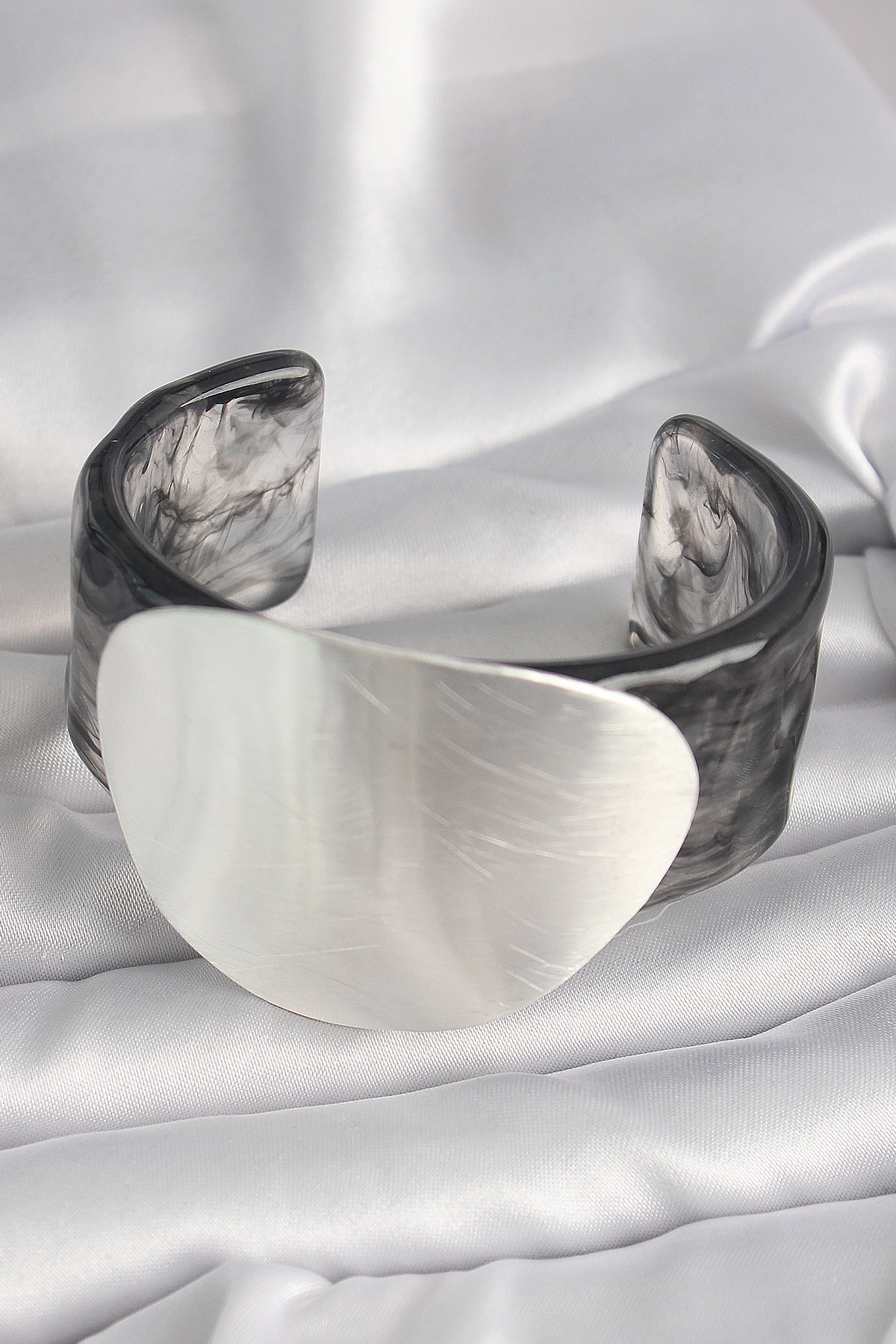 Siyah Mermer Desen Akrilik Pilastik Gümüş Plaka Model Vintage Kadın Bilezik