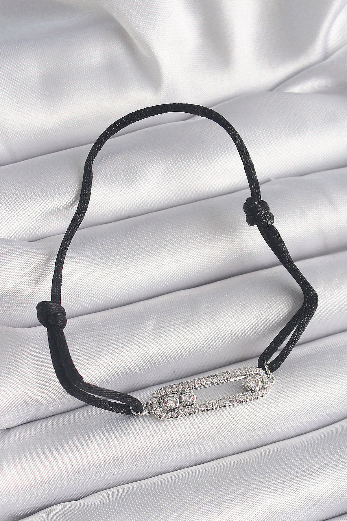 Siyah Renk İpli Asansör Zirkon Taşlı Gümüş Messika Model Kadın Bileklik