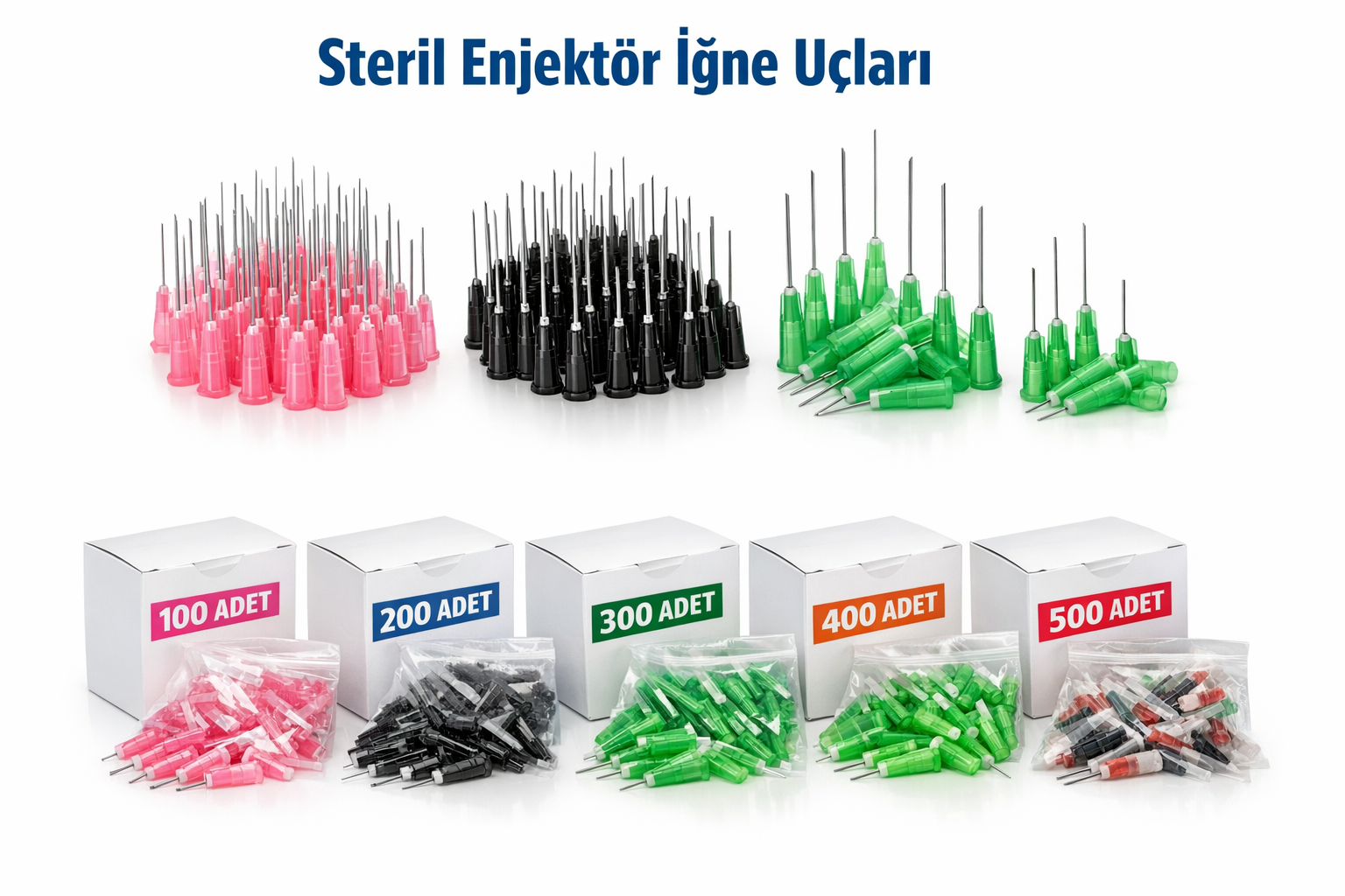 enjektör iğne ucu, steril iğne uçları, pembe uç iğne, siyah uç iğne, yeşil uzun iğne ucu, yeşil kısa iğne ucu, 100 adet iğne ucu, 200 adet iğne ucu, 300 adet iğne ucu, 400 adet iğne ucu, 500 adet iğne ucu, medikal sarf malzeme, tek kullanımlık iğne, hastane iğne ucu, klinik iğne ucu