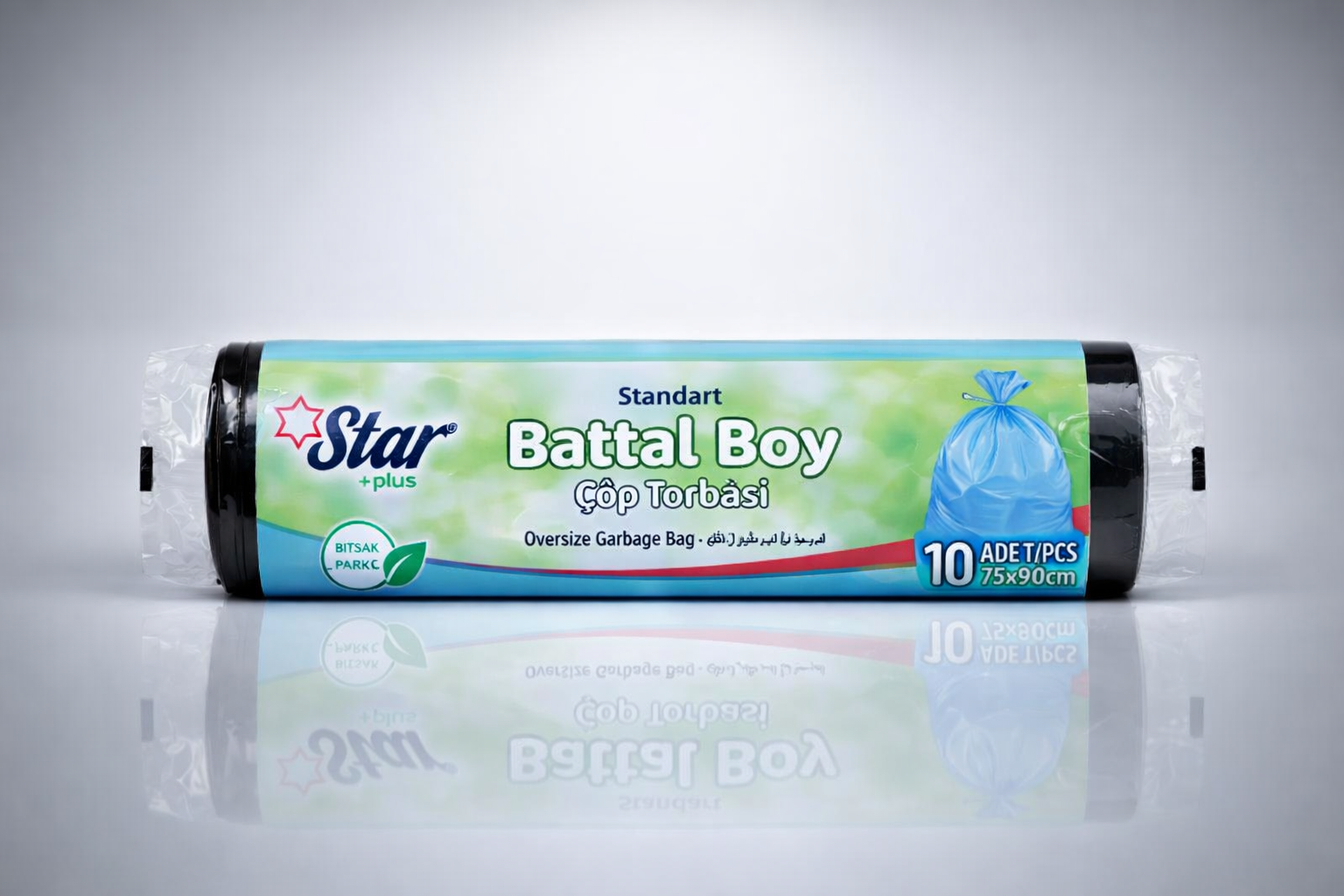 Star Plus Standart Battal Boy Atık Poşeti, ev ve iş yerlerinde büyük hacimli atıklar için pratik ve dayanıklı kullanım sunar. 75x90 cm ölçüsü sayesinde battal boy çöp kovaları ile uyumludur ve geniş iç hacmi sayesinde fazla miktarda atığı rahatlıkla taşır.