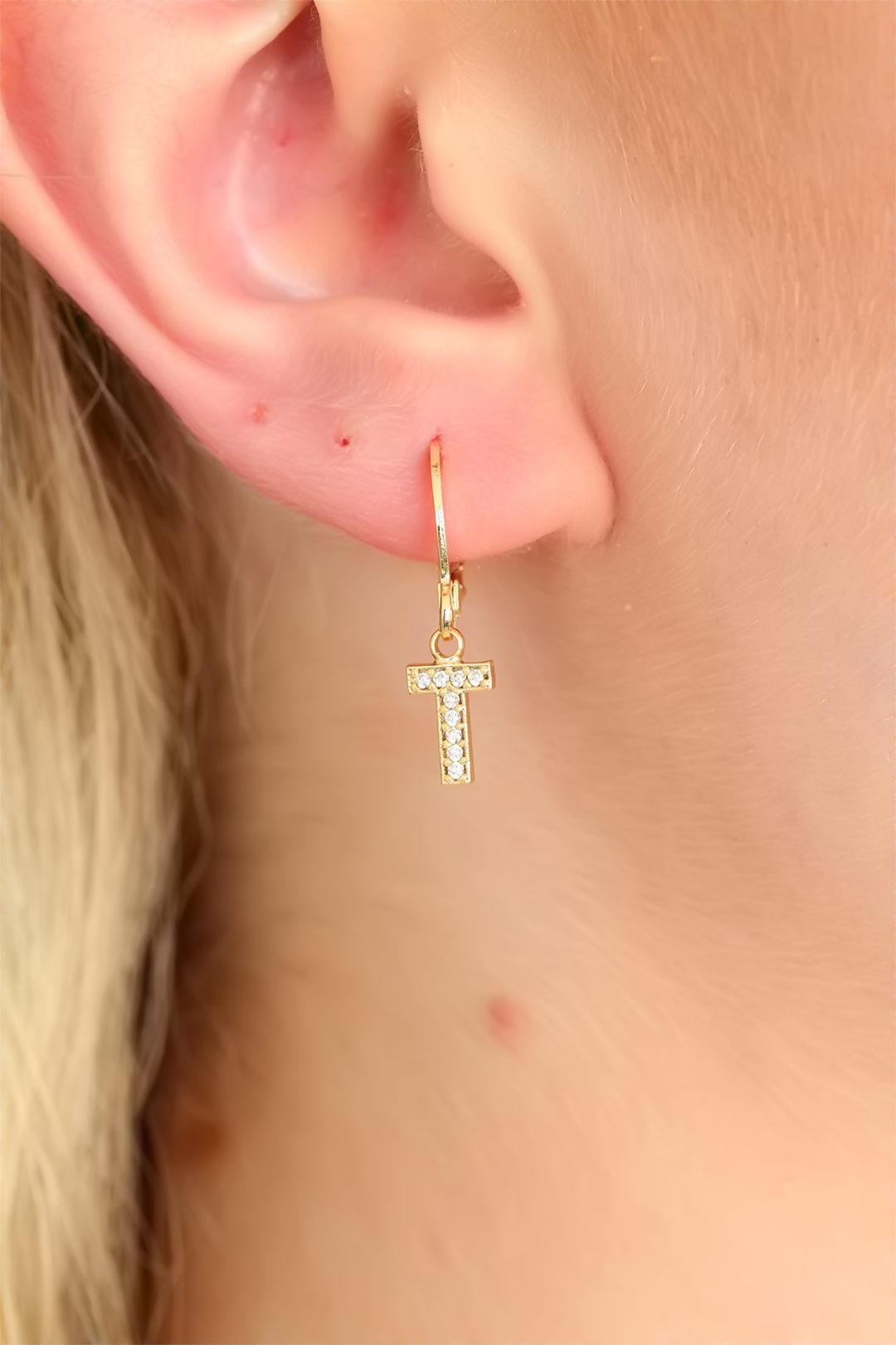 Gold Renk Zirkon Taşlı T Harf Bayan Küpe