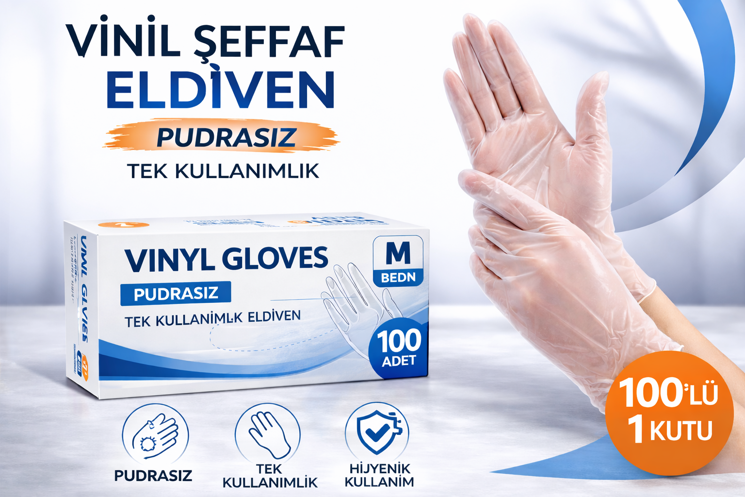 Esnek ve dayanıklı vinil malzemeden üretilmiş olan eldivenler, ele kolayca takılır ve kullanım sırasında hareket özgürlüğü sunar. Şeffaf yapısı sayesinde temiz ve profesyonel bir görünüm sağlar. Tek kullanımlık olması hijyen standartlarının korunmasına yardımcı olur.