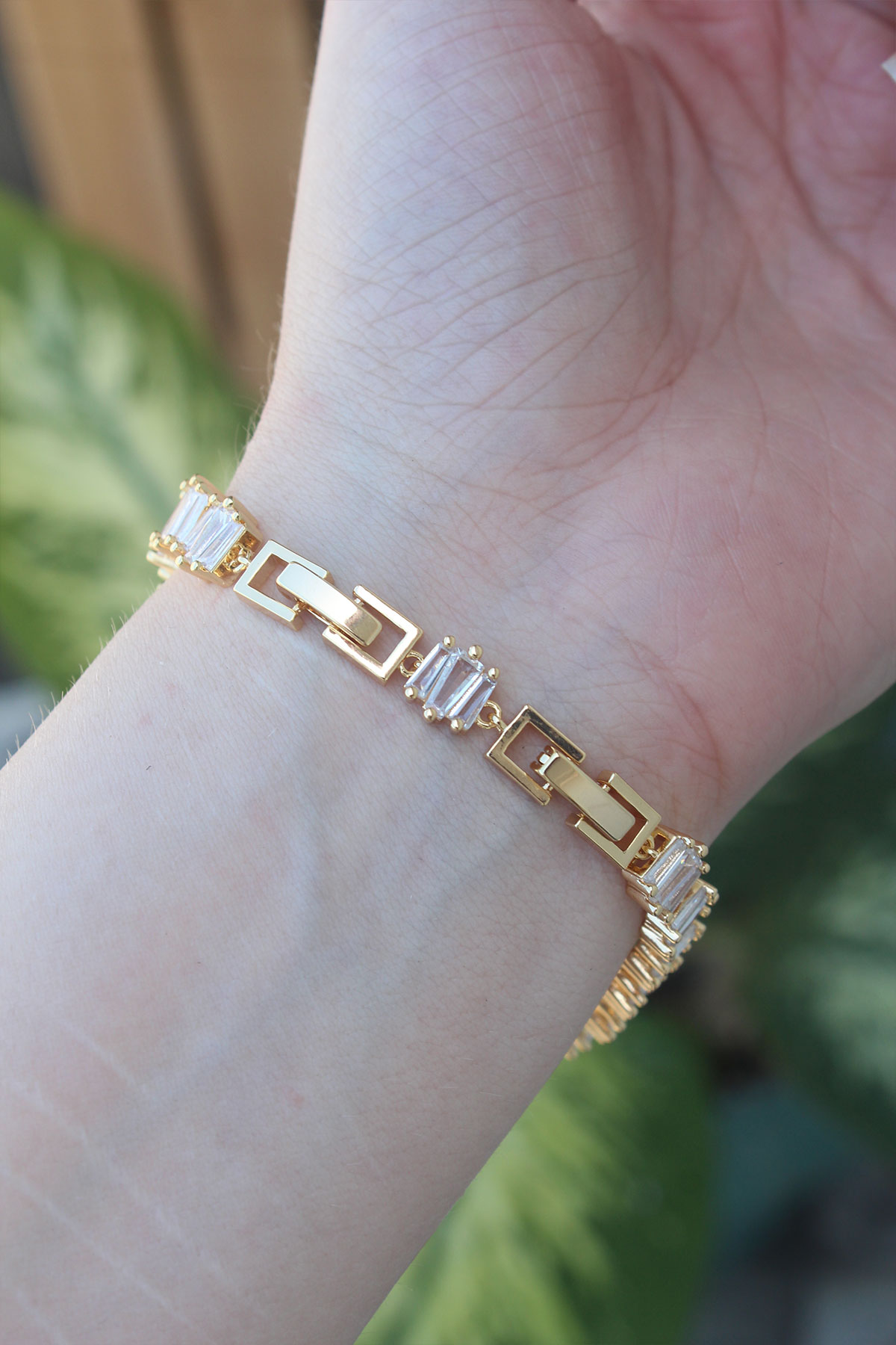 Vip Seri Pirinç Zirkon Taşlı Gold Renk Kare Su Yolu Model Bileklik