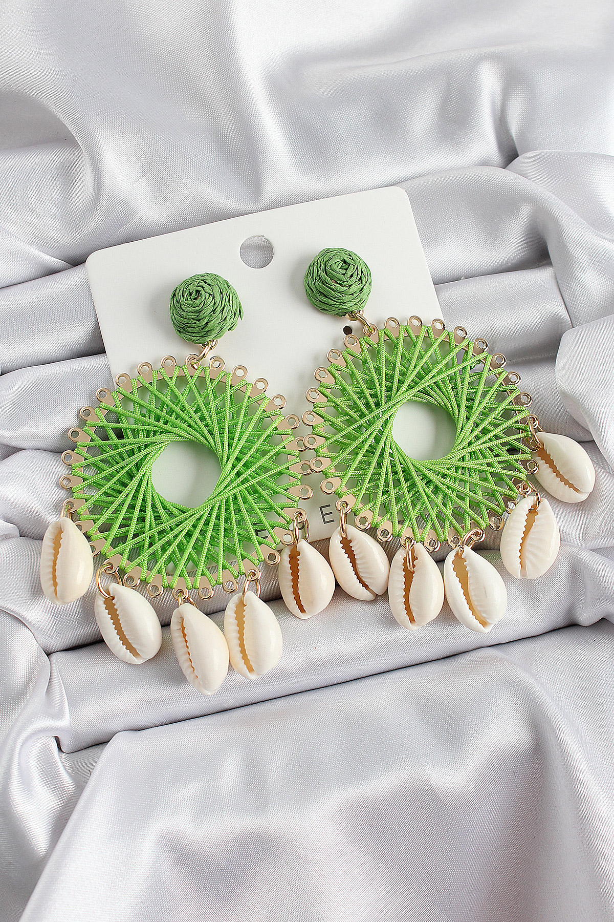 Yeşil Hasır Örgü Sarmal Model Sallantılı Deniz Kabuğu Detaylı Gold Renk Kadın Küpe