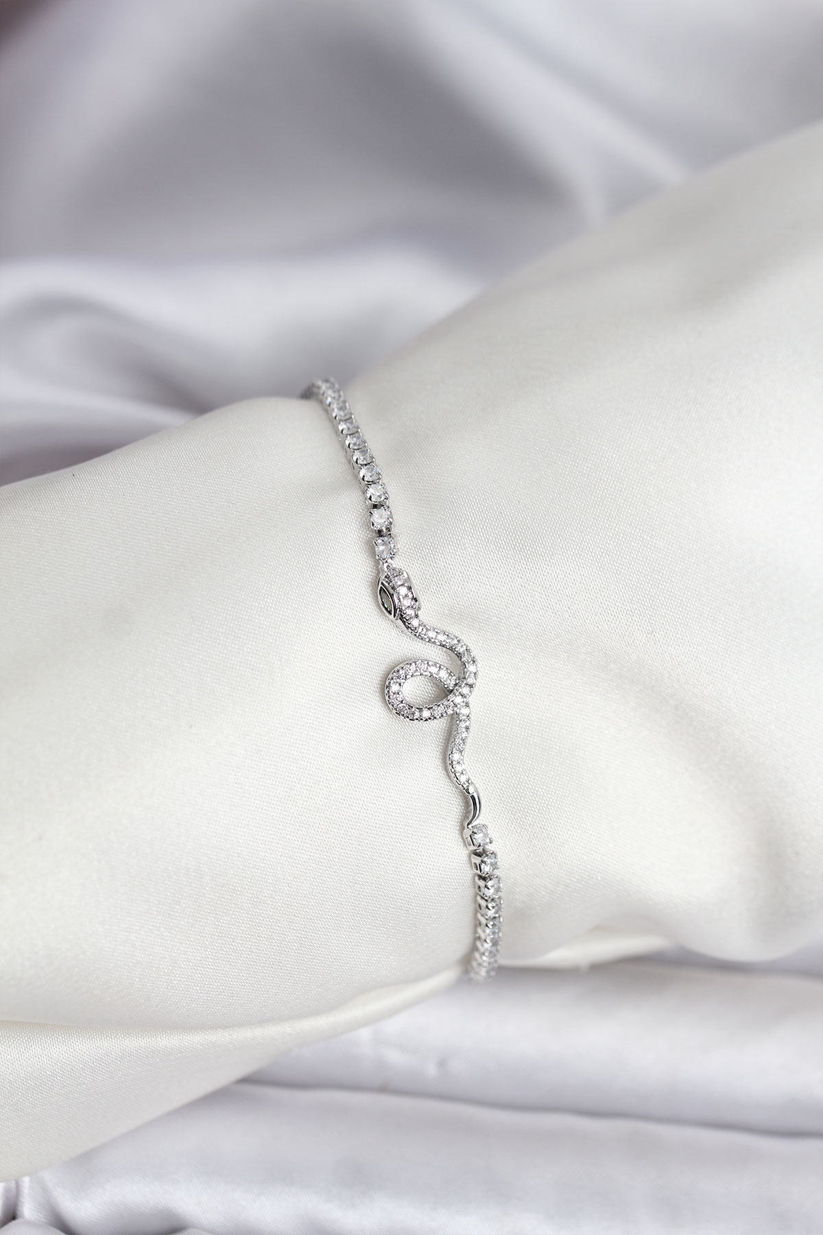 Yılan Model Zirkon Taşlı Gümüş Renk Pirinç Su Yolu Kadın Bileklik