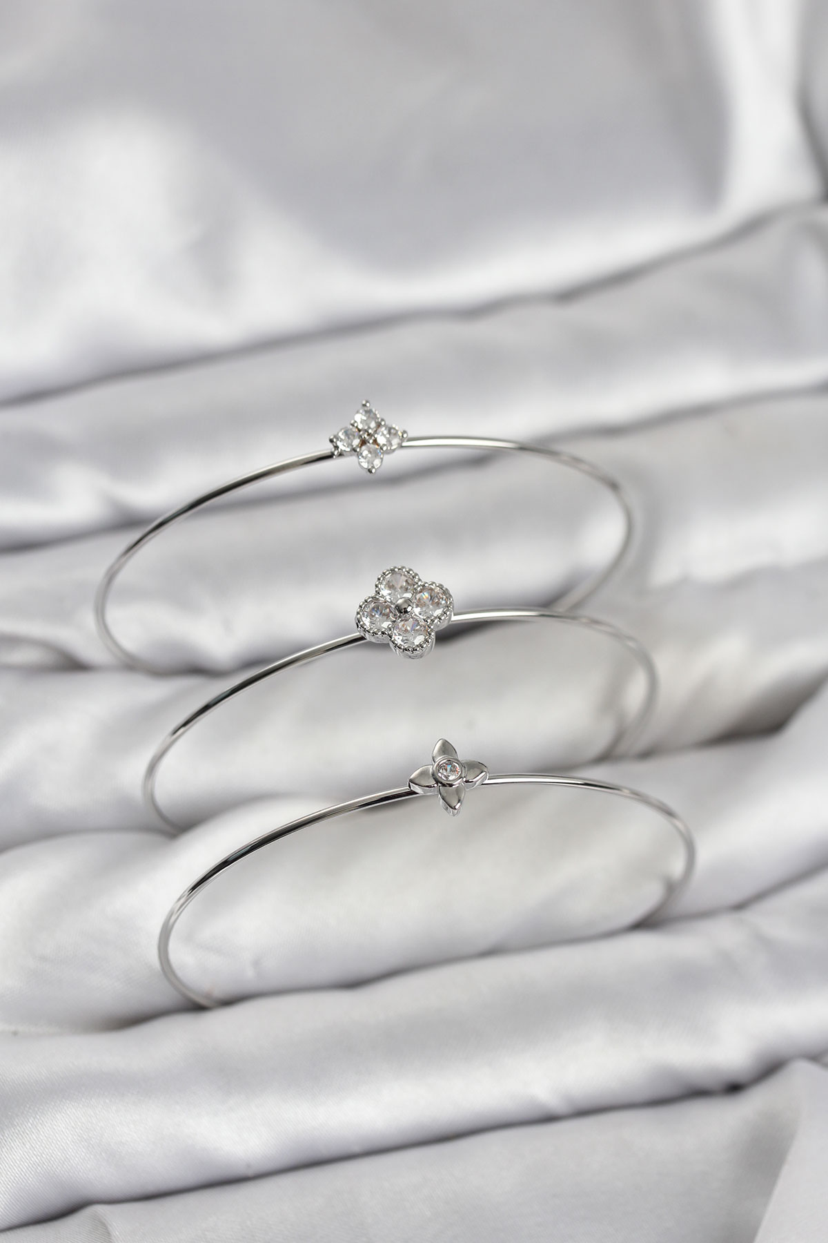 Zirkon Taşlı Gümüş Renk Yonca Tasarım 3'lü Kadın Bileklik Kombini